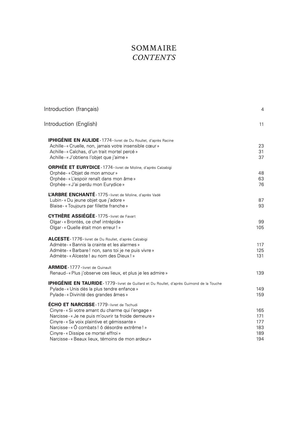 Outre une préface historique bilingue (français/anglais), qui aborde notamment le timbre de la voix et les interprètes ayant créé les rôles, les textes informatifs comprennent une brève présentation du contexte dramaturgique ainsi qu'une traduction littérale en anglais de chaque aria. Les partitions respectent les tonalités originales, le diapason de l’Académie royale de Paris étant près d’un ton plus bas